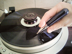 このたびはわが家でちょっとじっくり試してみることが叶った。まずはお約束、レコードの埃を払ってみる。ASB-1の金属部分に手を触れながら、サッと1面を掃き回してやるだけで作業は終了、何も難しいところはない。それで面白いように埃は掃き去ることができるが、もちろん効果はそれだけではない。再生音の音場へまとわりついていたザワつき、雑味といったものが拭い去られ、声は瑞々しさを増し、パーカッションの立ち上がりも明らかに向上する。これは試した者でないと分からない大きな効果である。試しにカートリッジ周りもサッと掃いてみたら、やはり同じように音質が向上する。しかもその差は結構大きい。金属よりも樹脂ハウジングのカートリッジに、より効きそうだ。